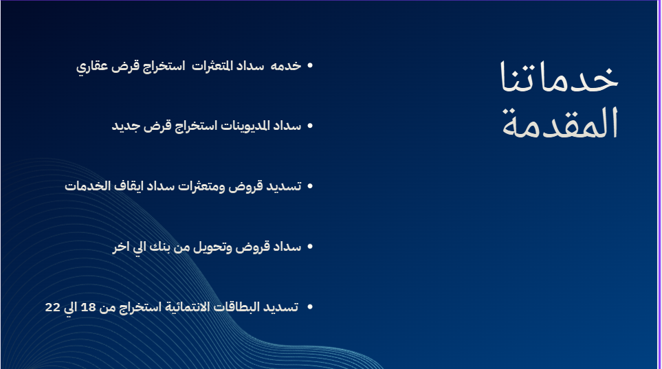 نحن هنا لنقدم لكم أفضل الخدمات المالية، حيث نقوم بتسديد جميع التزاماتكم ومساعدةجديده عن طريق البنوك شخصي او عقاري او شركه .
